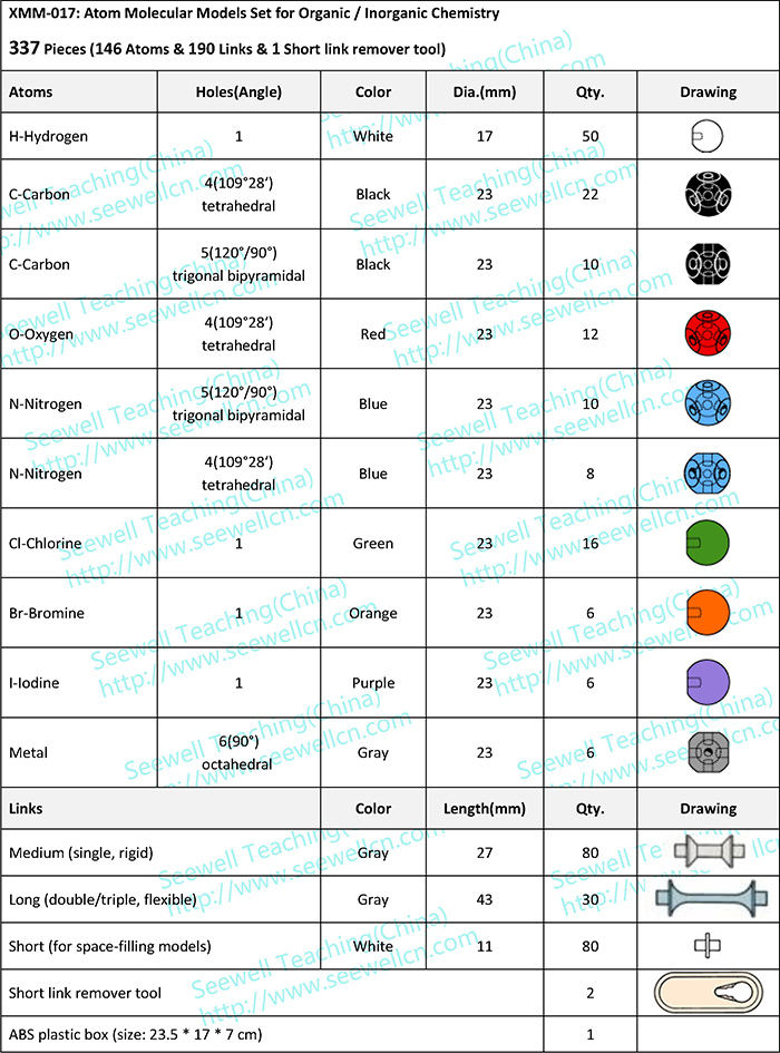 XMM-017: Atom Molecular Models Set for Organic / Inorganic Chemistry 337 Pieces (146 Atoms & 190 Links & 1 Short link remover tool) is designed for school teaching and lab research, It's Ball-and-Stick structure model, can build most of organic molecular models and most of inorganic molecular models....