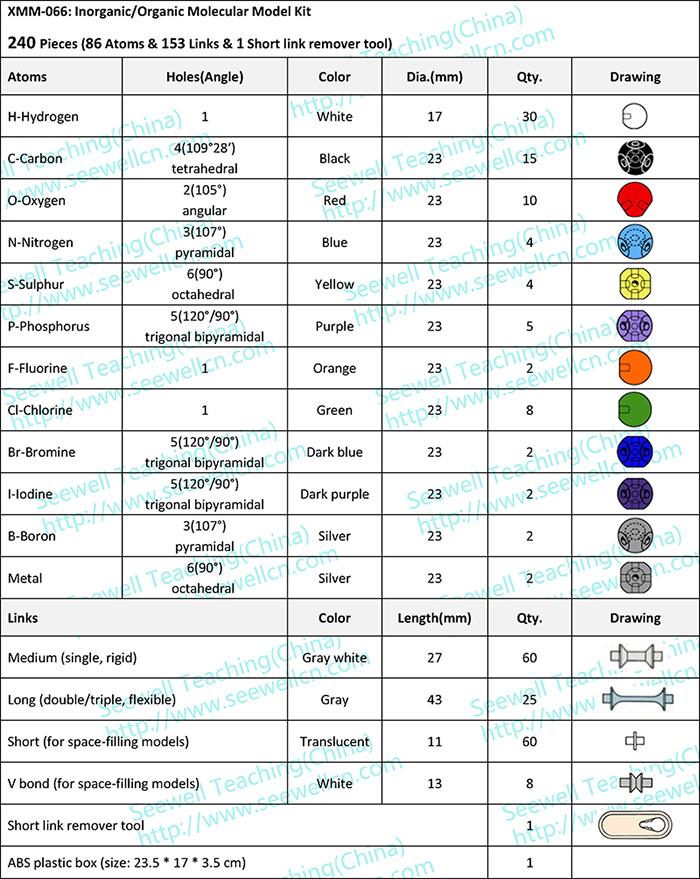 XMM-066: Inorganic/Organic Molecular Model Kit , 240 Pieces (86 Atoms & 153 Links & 1 Short link remover tool)
